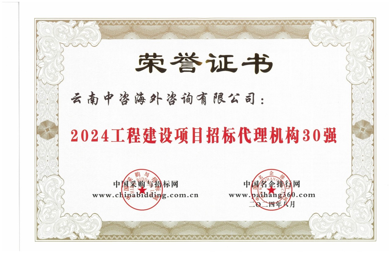 云南中咨海外咨詢有限公司在《招標投標法》頒布施行25周年系列活動暨2024(第18屆)招投標領域年度聚焦招標代理業(yè)務梳理優(yōu)化活動中,榮獲“2024招標代理行業(yè)綜合實力百強”、“2024政府采購項目招標代理機構30強”、“2024工程建設項目招標代理機構30強”榮譽獎項。同時公司員工3人榮獲優(yōu)秀咨詢工程師、12人榮獲優(yōu)秀招標師。本次活動由中國采購與招標網(wǎng)、中國名企排行網(wǎng)共同籌備組織。