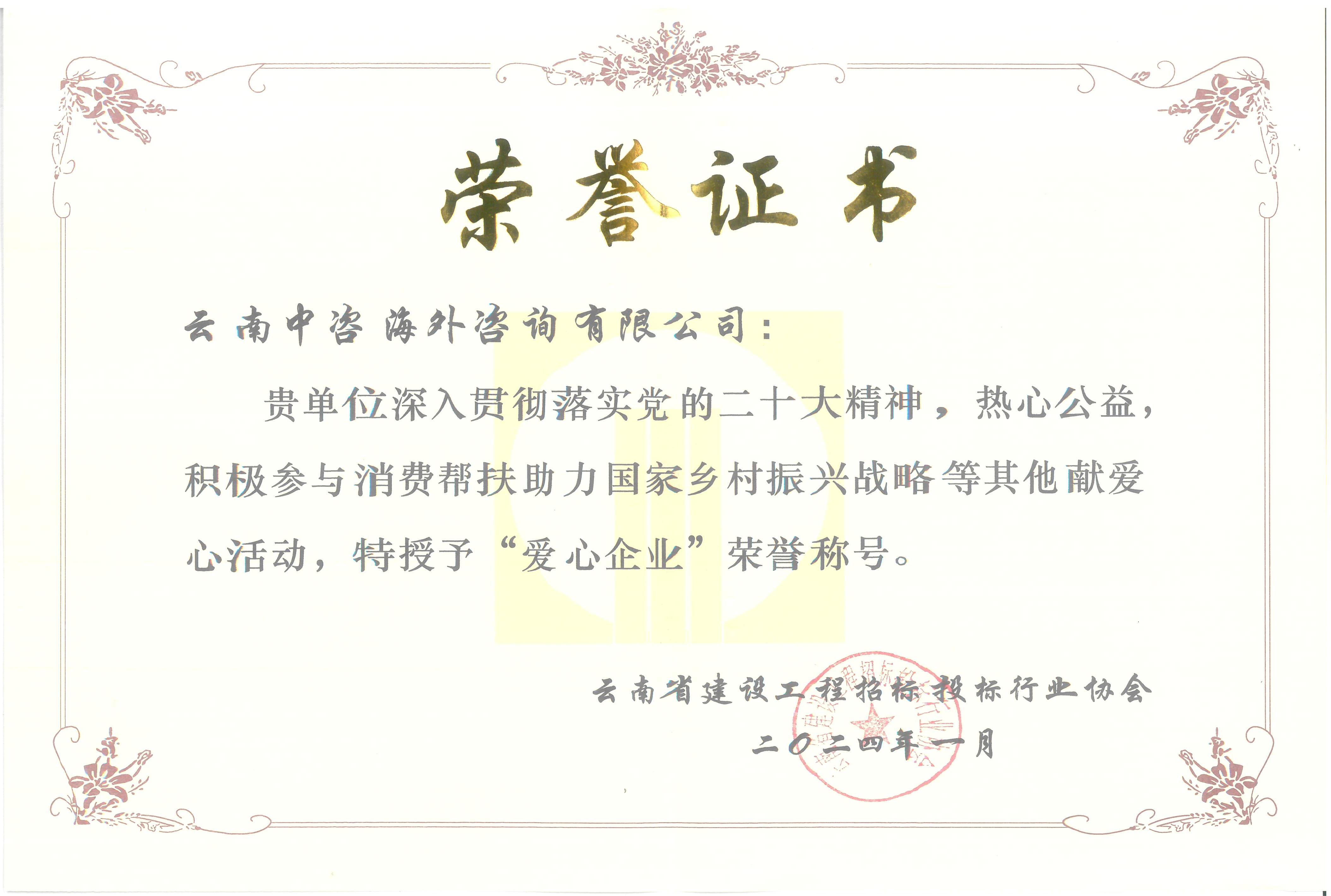 云南中咨海外咨詢有限公司成立于 2002 年,是云南省第一批成立的專業(yè)咨詢服務機構,也是本土招標代理行業(yè)率先獲得“科技型中小企業(yè)”稱號的公司。先后獲得了住建部頒發(fā)的《工程招標代理機構甲級資質證書》、財政部頒發(fā)的《中華人民共和國政府采購代理機構甲級資格證書》、發(fā)改委頒發(fā)的《中華人民共和國中央投資項目招標代理機構乙級資格證書》、商務部頒發(fā)的《機電產(chǎn)品國際招標代理機構》資格。在工程造價領域,獲得了住建部頒發(fā)的《工程造價咨詢企業(yè)甲級資質證書》。公司是“中國招標投標協(xié)會”會員單位、“云南省建設工程招標投標行業(yè)協(xié)會”副會長單位、“云南省招標投標協(xié)會”副會長單位、“云南省水利工程行業(yè)協(xié)會”會員單位、“云南省建設工程造價協(xié)會”會員單位。